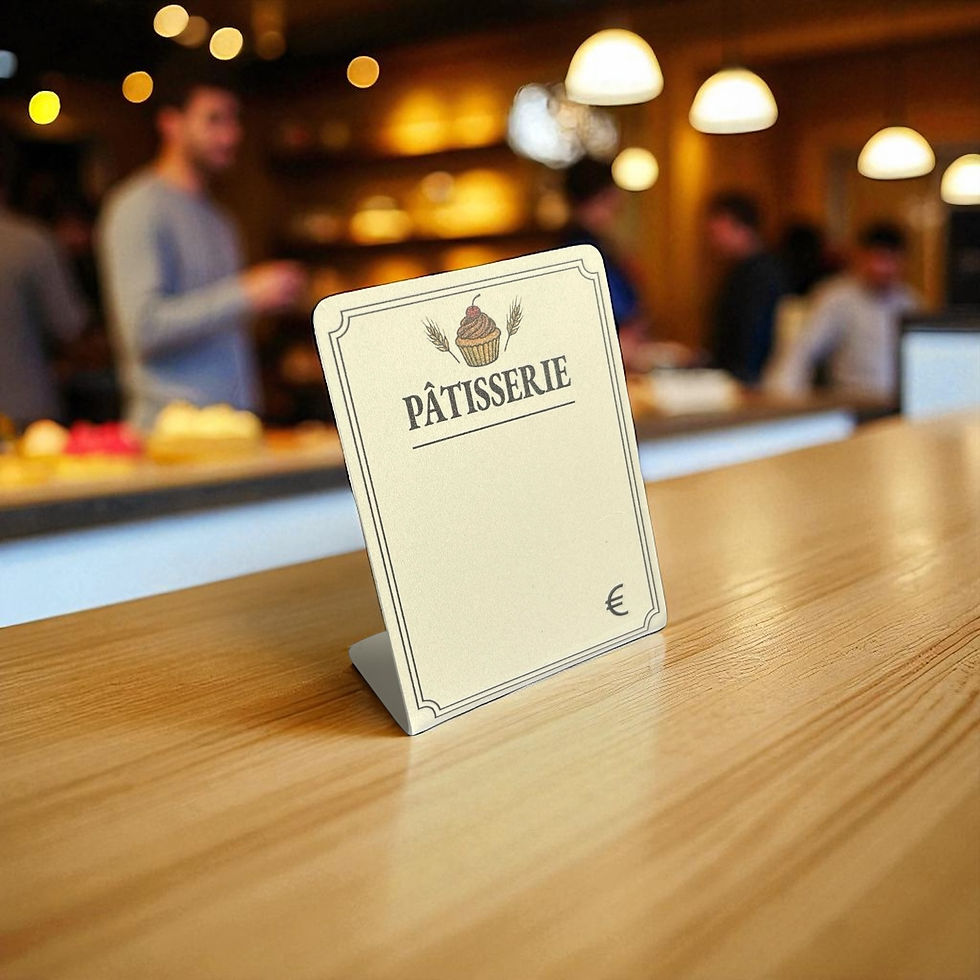 Les étiquettes plates nécessitent l'utilisation d'un support porte-étiquette en bois, plexiglas, métal ou PVC. Elles peuvent également s'adapter aux glissières pré-installées dans certaines vitrines.